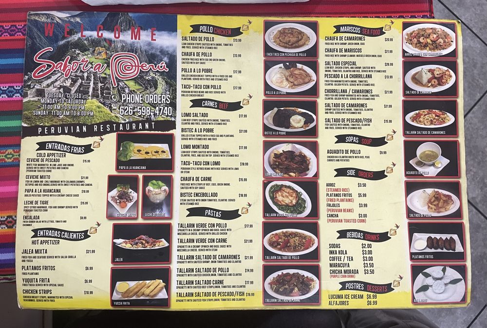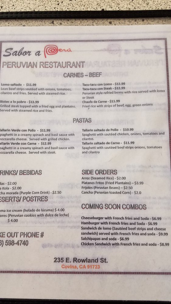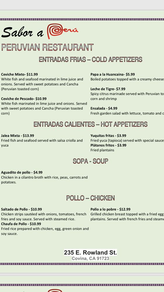 Sabor a Perú offers an authentic Peruvian dining experience in Covina, CA. Their menu features beloved dishes such as lomo saltado and chaufa, which have garnered rave reviews from customers. The restaurant provides a casual and welcoming atmosphere, with options for takeout, delivery, and catering. Customers appreciate the generous portions, fresh flavors, and reasonable prices. The friendly staff and efficient service add to the overall dining experience. With options for outdoor seating, happy hour specials, and even plastic-free packaging, Sabor a Perú caters to a variety of preferences. If you're looking for a taste of Peru in a welcoming setting, Sabor a Perú is a must-try.